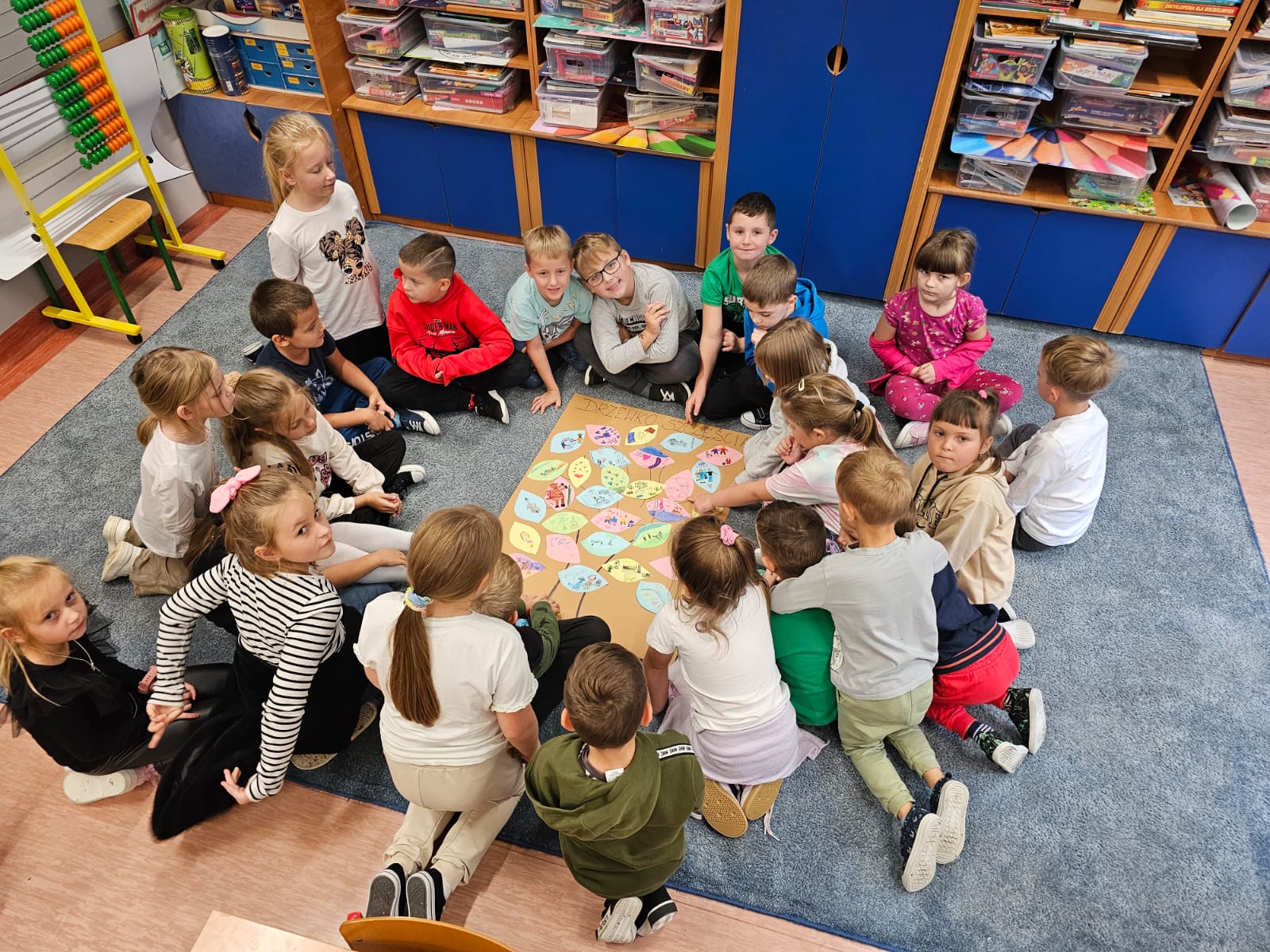 Wspólnie zrobiliśmy drzewko szczęścia, opaski uśmiechu, codziennie mieliśmy taneczną przerwę szczęścia.
